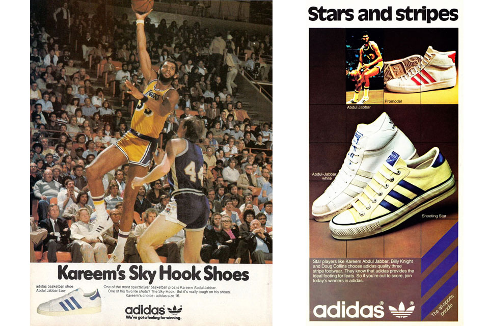adidas 不服,篮球鞋最挣钱,必需要插一脚! adidas 的球鞋设计功力可比美国本土“某帆布鞋”品牌强太多,而且他们还找到了 NBA 历史得分王 Abdul-Jabbar 代言,最牛X的时候,NBA 有 75% 的人都穿着 adidas 比赛。