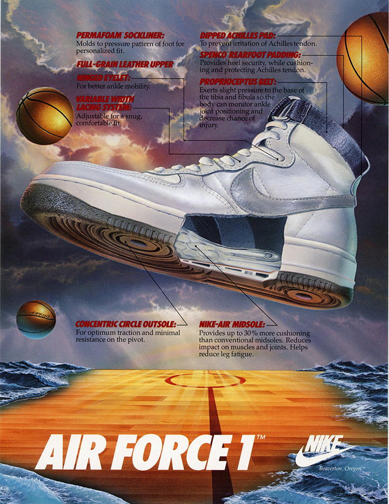 Nike 在篮球鞋领域的碾压开始于 Air Force 1,这双鞋第一次把气垫运用到了篮球鞋里,并且名字也够霸气(与美国总统专机名称相同)。刚穿上皮质篮球鞋没几年的球员们哪见过这种黑科技,纷纷拜倒在 Nike 脚下。