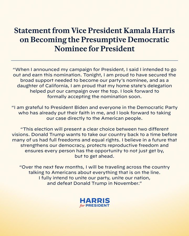 据悉,哈里斯需要在8月份民主党全国代表大会的第一轮投票中获得近4000名民主党代表中至少1976名代表的支持才能获得党内提名。