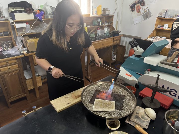 勾画底稿、描摹轮廓、磨搓丝线……在大学生们的一对一指导支持下,孩子们以小组合作形式设计制作起自己的专属花丝镶嵌作品,而得益于运用幻灯片、动画和仿真软件的演示,不少孩子最终都收获了一件独一无二的作品。