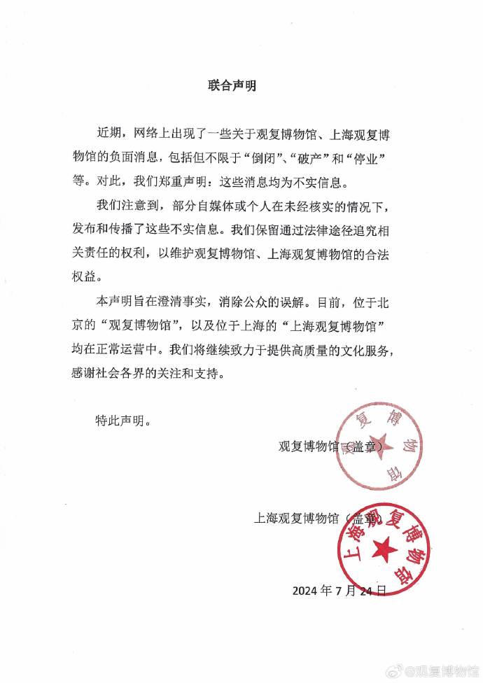 7月24日,@观复博物馆 发布声明称,近期,网络上出现了一些关于观复博物馆、上海观复博物馆的负面消息,包括但不限于“倒闭”、“破产”和“停业”等。这些消息均为不实信息。目前,位于北京的“观复博物馆”, 以及位于上海的“上海观复博物馆”均在正常运营中。
