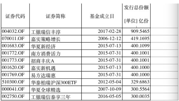 Wind数据统计显示,在工银丰淳之前,市场上发行规模最大的基金是2006年成立的嘉实策略增长,曾创下419.17亿的发行纪录。紧随其后的则是2015年成立的5只“国家队”基金,发行规模均为400.1亿。此外,华泰柏瑞沪深300ETF、华夏全球精选以及工银瑞信泰享三年的发行规模都在300亿以上,这也是目前市场上发行规模前十大基金的门槛。