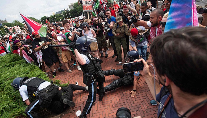 就在内塔尼亚胡演讲当天,对巴以冲突不满的示威者在国会山抗议游行,谴责内塔尼亚胡是战争犯。部分抗议者把美国国旗换成了巴勒斯坦国旗,还有抗议者与警方发生冲突。