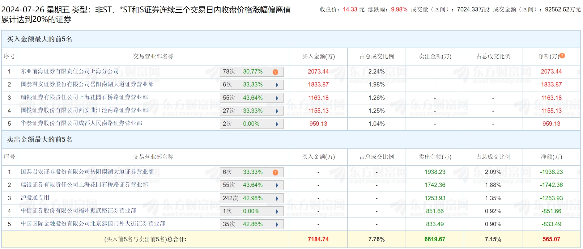 - 其中,知名游资东亚前海证券有限责任公司上海分公司、国泰君安证券股份有限公司岳阳南湖大道证券营业部、瑞银证券有限责任公司上海花园石桥路证券营业部分别买入2073.44万元、1833.87万元、1163.18万元。