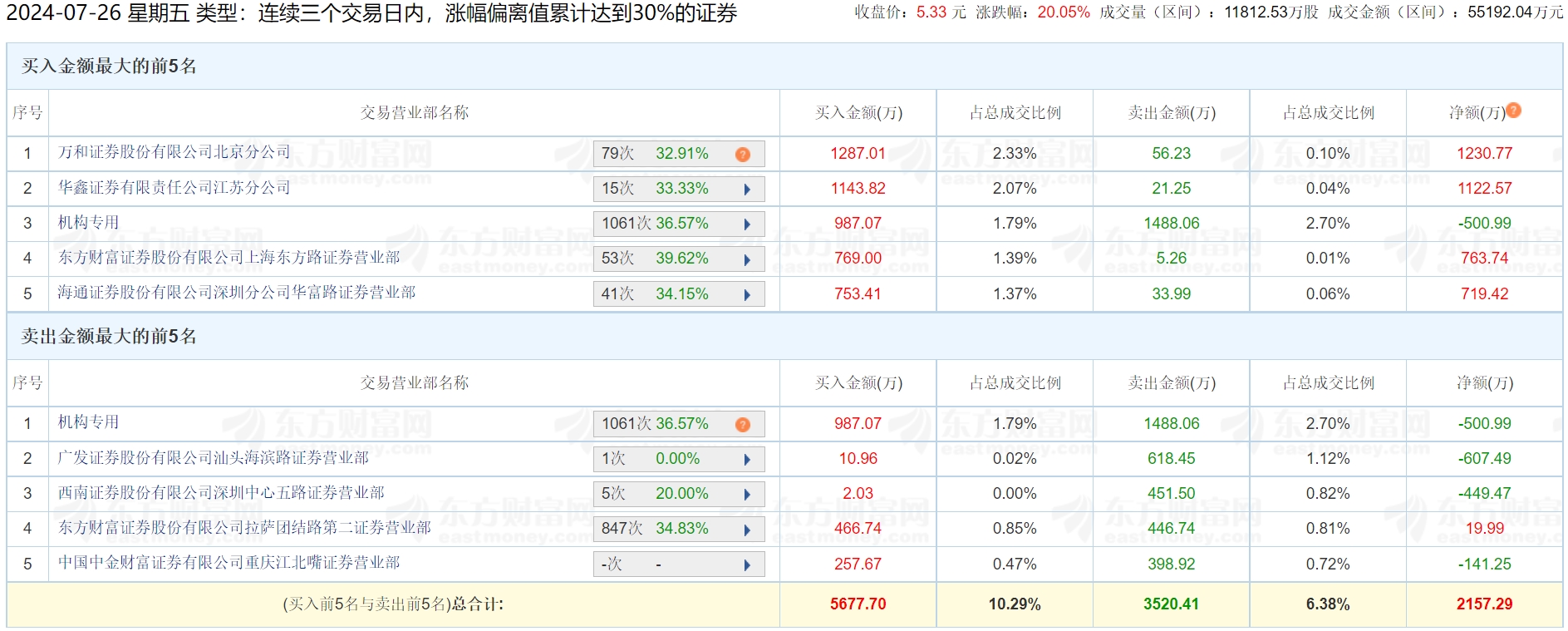- 其中,万和证券股份有限公司北京分公司、华鑫证券有限责任公司江苏分公司、机构专用分别买入1287.01万元、1143.82万元、987.07万元。