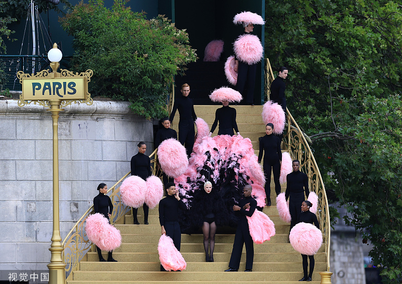 和传统奥运会开幕式将运动员入场和表演分开不同,本届巴黎奥运会开幕式的流程被重新解构:运动员入场与现场表演是交织进行的。比如游船前行到圣路易斯岛时,美国知名歌手Lady Gaga和舞者一起带来卡巴莱歌舞表演。卡巴莱是起源于欧洲的一种特色歌厅式音乐剧,特点是通过歌曲直接与观众分享故事或感受。