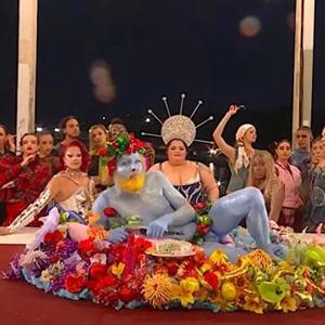 令人目眩的走秀结束后,一只法式大餐中常见的大盘出现在长桌中央,盖子掀开,懒洋洋地斜躺在鲜花和水果中的酒神唱着“J’adore regarder danser les gens, J’adore J’adore J’adore (我就是喜欢看人跳舞,哦我爱我爱我爱)”现身。这段表演来自法国艺术家菲烈·卡特林(Philippe Katerine),在舞者们和DJ的簇拥中,卡特林接着演唱了他为开幕式创作的新歌《NU》(赤身裸体):