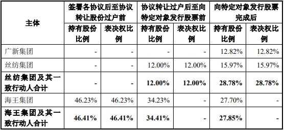 定增完毕后,原实控人海王集团及其一致行动人合计持股比例为27.85%,新实控人丝纺集团及其一致行动人持股比例为28.78%。