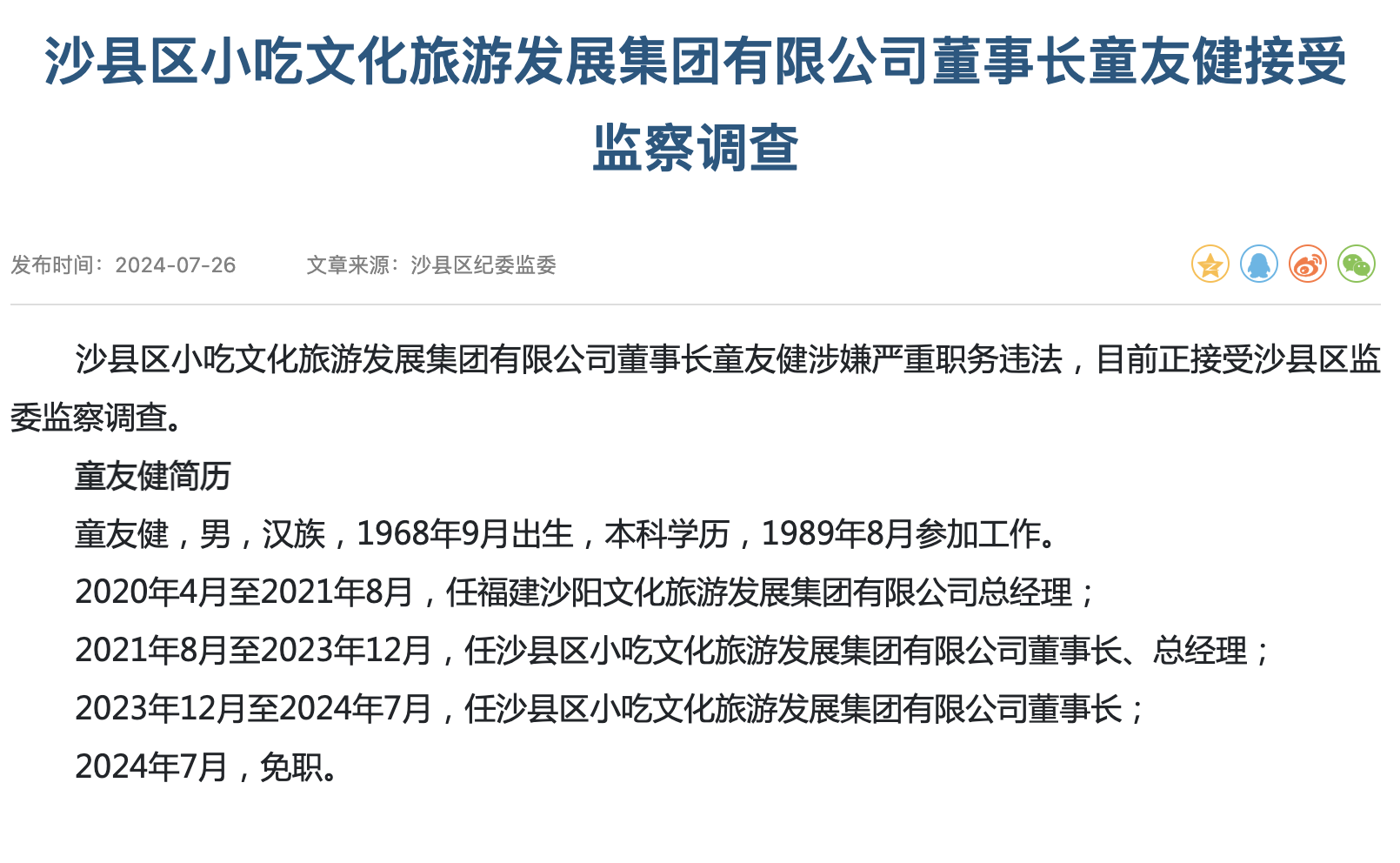 童友健的公开简历信息显示,他于2021年8月-2023年12月,任沙县区小吃文化旅游发展集团有限公司董事长、总经理;2023年12月-2024年7月,任沙县区小吃文化旅游发展集团有限公司董事长;2024年7月被免职。