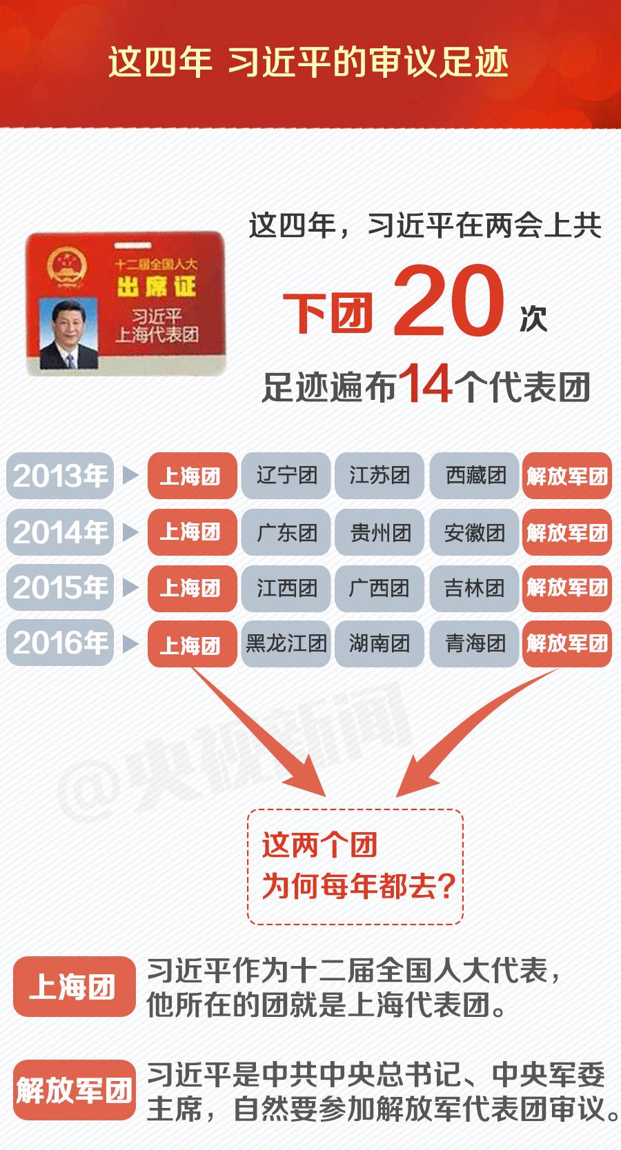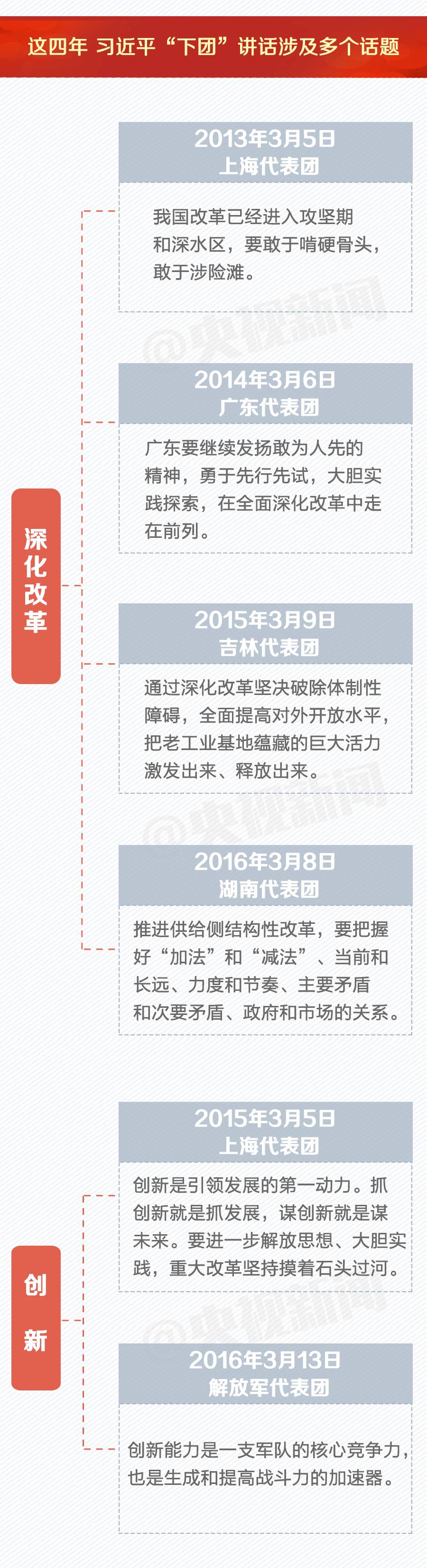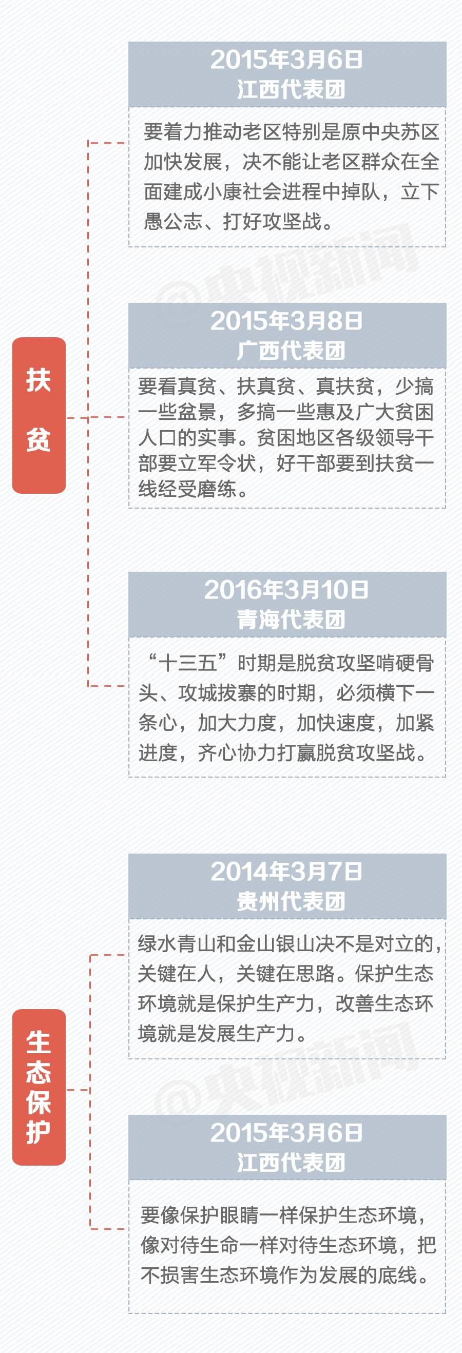 除了上海和解放军两个代表团以外,2013年以来,习近平每年还会参加三个代表团的审议,和代表们谈改革、谈创新、谈生态保护、谈作风建设……当然,也少不了最让总书记牵挂的扶贫。