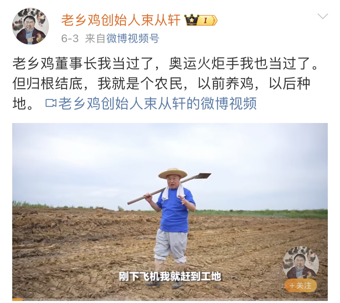 在6月3日的微博中,他写道“老乡鸡董事长我当过了,奥运火炬手我也当过了。但归根结底,我就是个农民,以前养鸡,以后种地。”并配上了他在农场里参加开工仪式的视频,意在对老乡鸡自有供应链的蔬菜农场进行宣传。