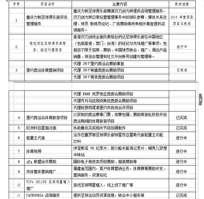 2016年,在体育业务方面,当代明诚与奥组委、欧洲足球协会联盟,国际知名俱乐部与知名球员;品牌企业如 361 度、鸿星尔克、RIO 等均建立了合作关系。在体育产业方面,公司全资子公司双刃剑与重庆力帆足球俱乐部有限公司签署了《关于重庆力帆足球俱乐部有限公司之咨询服务合同》,全面代理重庆力帆足球俱乐部商务开发事宜;格拉纳达足球俱乐部有限公司签署《关于格拉纳达足球俱乐部有限公司之区域独家商务代理合同》,香港双刃剑将为格拉纳达足球俱乐部提供中国地区(包括香港、澳门、台湾)经纪与市场推广等服务。此外双刃剑、MBS 还拟与意大利波佐家族共同开拓欧洲及中国的体育市场。在融资业务上,公司于上年度获准发行的非公开债券,2016年已成功发售并募集 4 亿元,弥补了公司在营运资金上的不足。