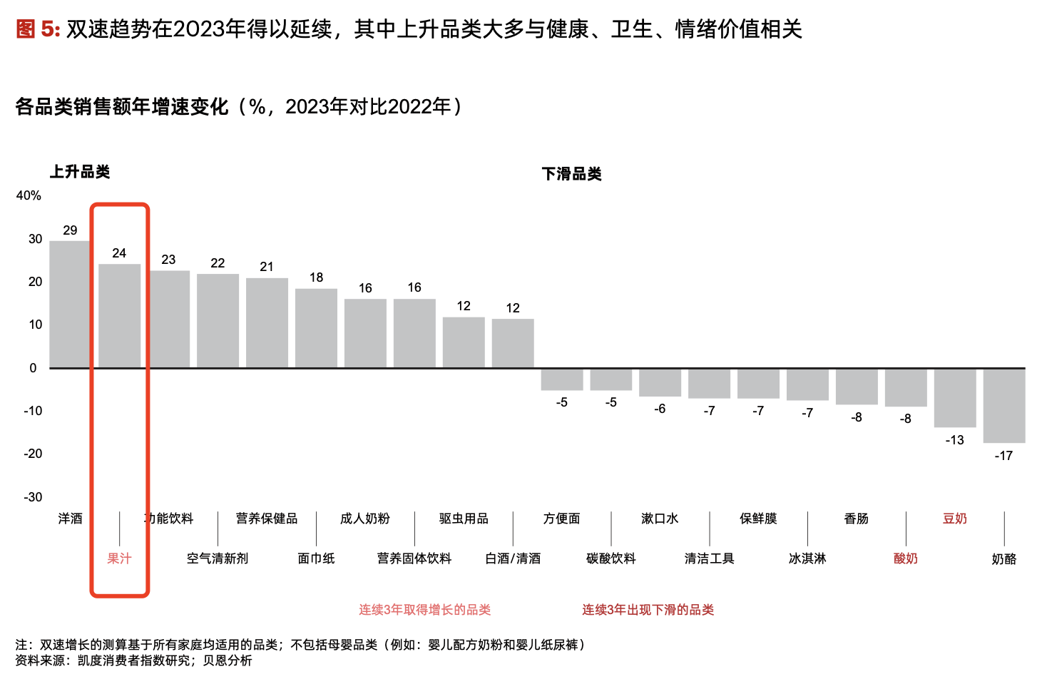据凯度消费者指数与贝恩公司今年联合发布的2024中国购物者报告,在2024年1季度,“近水”饮料品类保持高增长,其中果汁增长20.8%、即饮茶增长8.6%,瓶装水增长5.6%,果汁品类为增长最快的细分品类。而在2023年,果汁品类销售额年增速更是达到24%。