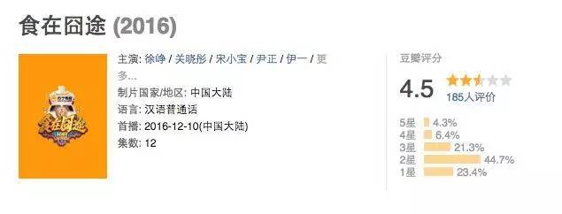 但是正所谓没有期望就不会有失望。已经播出了11期、即将在本周收官的《食在囧途》,到最后也没能取得像“囧”系列电影那般的成绩。豆瓣4.5的低分,略差的口碑表现,徐峥首次试水综艺出品人就出师不利,本想着将“囧”品牌做得更加丰满,却不知现实是这般骨感。