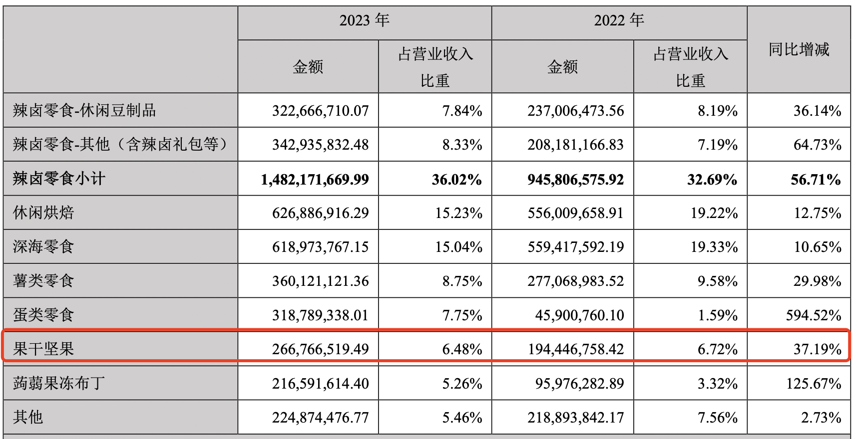 从2023年和2022年的营业收入看,果干坚果的营收分别为2.67亿元和1.94亿元,占总营收的比例分别是6.48%、6.72%,营收被此前排在果干坚果之后的蛋类零食大幅超越,后者的营收是从2022年的0.46亿元猛增至2023年的3.19亿元。