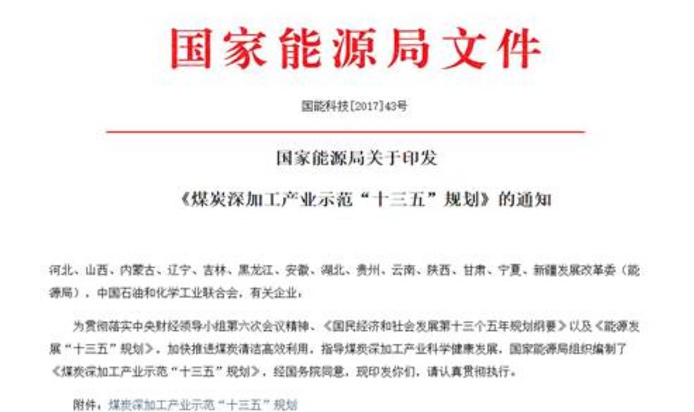 3月3日,能源局印发《煤炭深加工产业示范“十三五”规划》,其中规模目标(预期性),预计2020 年,煤制油产能为1300万吨/年、煤制天然气产能为170 亿立方米/年、低阶煤分质利用产能为1500 万吨/年(煤炭加工量)。