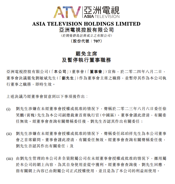 亚洲电视控股8月2日晚间在港交所公告,于2024年8月2日,董事会决议罢免刘敏斌作为董事会主席之职务,并暂停其作为公司执行董事之职务,即时生效。根据董事会决议,未经董事会明确授权,刘敏斌不得以任何方式代表公司行事。鉴于刘敏斌的回应,公司将对相关事宜进行进一步调查。