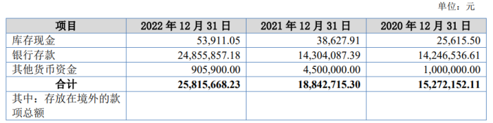 报告期内,公司银行存款分别为1424.65万元、1430.41万元和2485.59万元;货币资金余额分别为1527.22万元、1884.27万元和2581.57万元,占各期流动资产比例分别为26.06%、25.48%和23.18%,占比较为稳定。