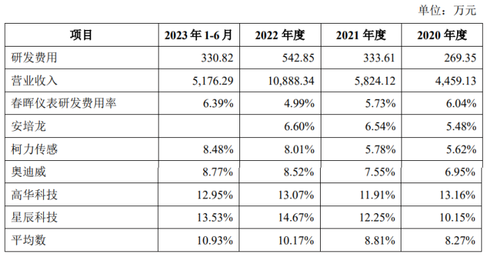 2021年-2023年,春晖仪表研发费用分别为333.61万元、542.85万元和595.09万元,研发费用率分别为5.73%、4.99%、5.68%,低于同行业可比公司。