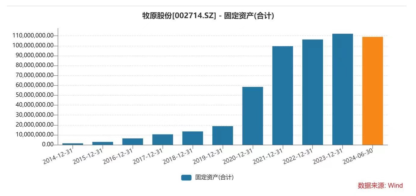 2024年中报告显示,截至2024年中,牧原固定资产余额1089.85亿元。这也是近十年中,牧原股份固定资产首次出现下滑。