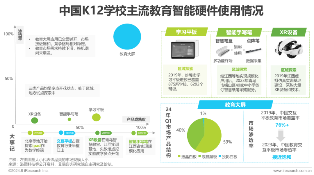 中国K12学校的教育智能硬件以教育大屏为主,教育大屏当前已在校内全面铺开,为交互平板应用最广泛的市场(教育领域占比达72%),但当前教育市场已趋于饱和,竞争格局也相对稳定,总体需求呈下滑态势,换机潮也尚未爆发。同时,学习平板、智能手写笔、XR设备在全国多点开花,处于区域或单校试点探索中。