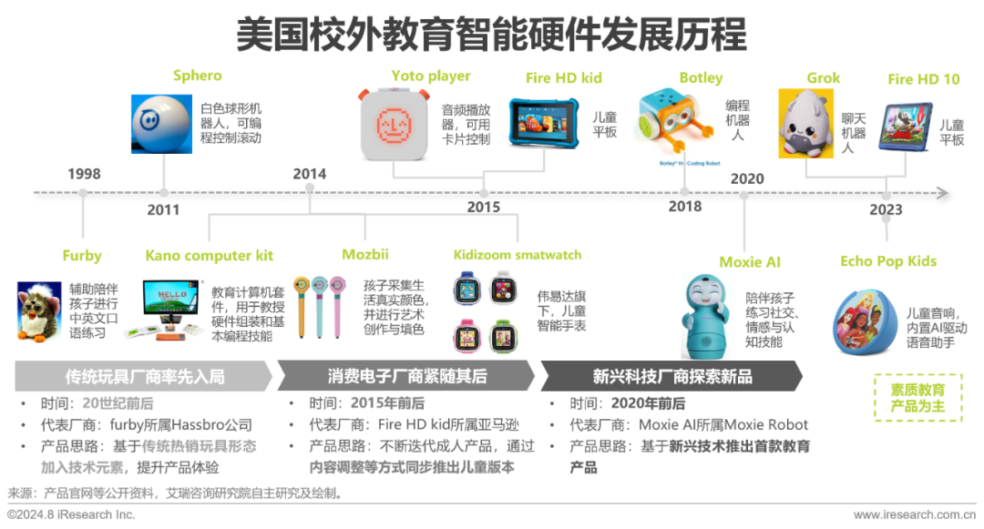 美国校外教育智能硬件以素质教育类产品为主,从阅读、音乐、情感认知等多维度为孩子提供综合教育服务。20世纪前后,传统玩具厂商率先入局,如在原有毛绒玩具furby的基础之上加入口语练习功能。2015年前后,消费电子厂商紧随其后,如亚马逊推出Fire HD的儿童版,提供阅读、音乐、游戏等综合性儿童内容。
