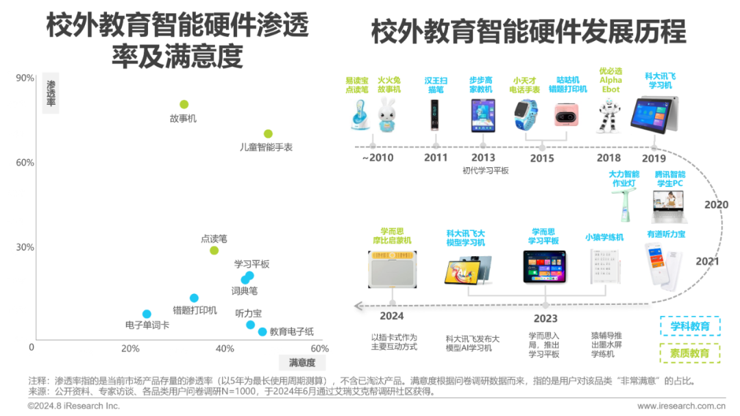 单功能产品种类众多,各自解决不同细分场景下的痛点需求,如错题打印、翻译扫描、故事熏听等。从市场情况来看,传统品类如故事机、儿童智能手表的渗透率更高,创新品类如教育电子纸、听力宝、词典笔的满意度更高。