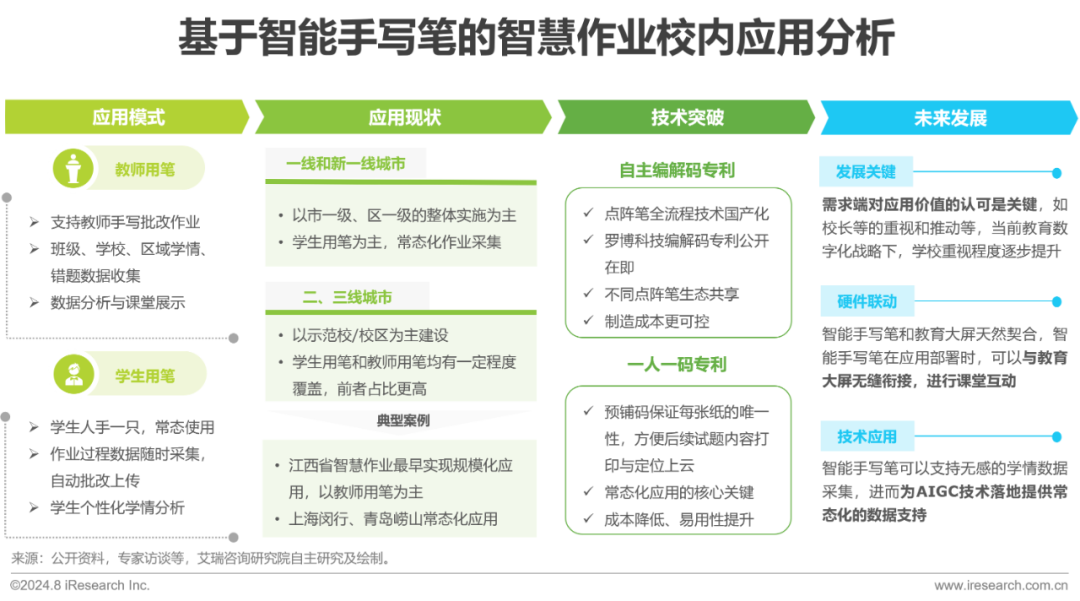 相比于教育大屏、学习平板,智能手写笔在校内的渗透率目前较低,但在自主编解码技术、“一人一码”技术突破下,常态化应用逐渐得以实现。从应用模式来看,教师用笔模式适合前期探索,学生用笔模式通常在验证后推广。从应用现状来看,当前一线城市以市/区一级的整体覆盖为主,学生用笔占据主导,二、三线城市以示范校为主进行建设,学生和教师用笔均有落地。