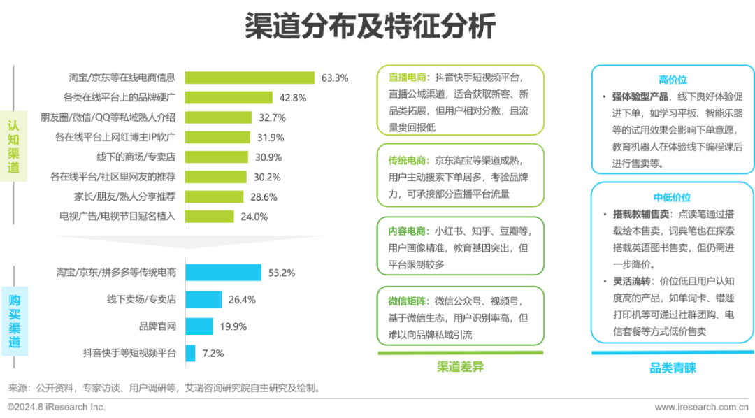 在具备了有效细分场景这一必要条件之后,寻找到适应时代发展、匹配品类特点的渠道则成为关键的下一步。在线上渠道未兴起的时代,儿童手表更依赖线下商超和专卖店;随着电商平台、私域社群的发展,更低客单价、更易流转的错题打印机、词典笔、电子单词卡流行起来;短视频时代,直播讲解、公域引流更适合新品类的推广,成为听力宝、学练机等创新品类的关键销售渠道。未来,教育智能硬件仍需要进一步深挖更多的细分场景,并结合适配产品特色和时代特征的渠道,以打造特定场景的爆款产品。