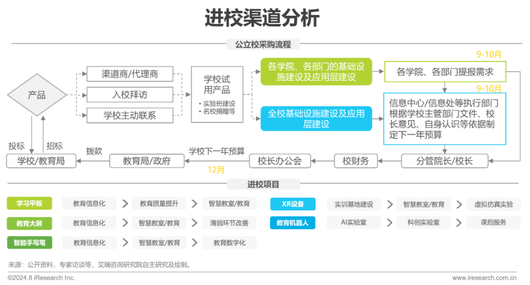 从进校流程来看,包含前期的需求对接与论证、中期的试点验证、后期的采购落地等,其中尤其以公立校的进校流程更为复杂,存在多个层级的提报与审批,横跨周期时间也更长。私立校的采购流程相对简单,学校自主权也更大。