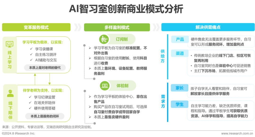 通过线上的平板自学,线下的伴学服务,AI智习室变革了传统线下教培的服务模式,本质上是用平板替代老师,用自习室、伴学服务营造闭环服务,以打造更加高效、低成本、合规的商业模式。在订阅制收费模式下,学习平板厂商是自习室主体的上游,不直接作为盈利项,而是成为整个AI智习室的核心部分。