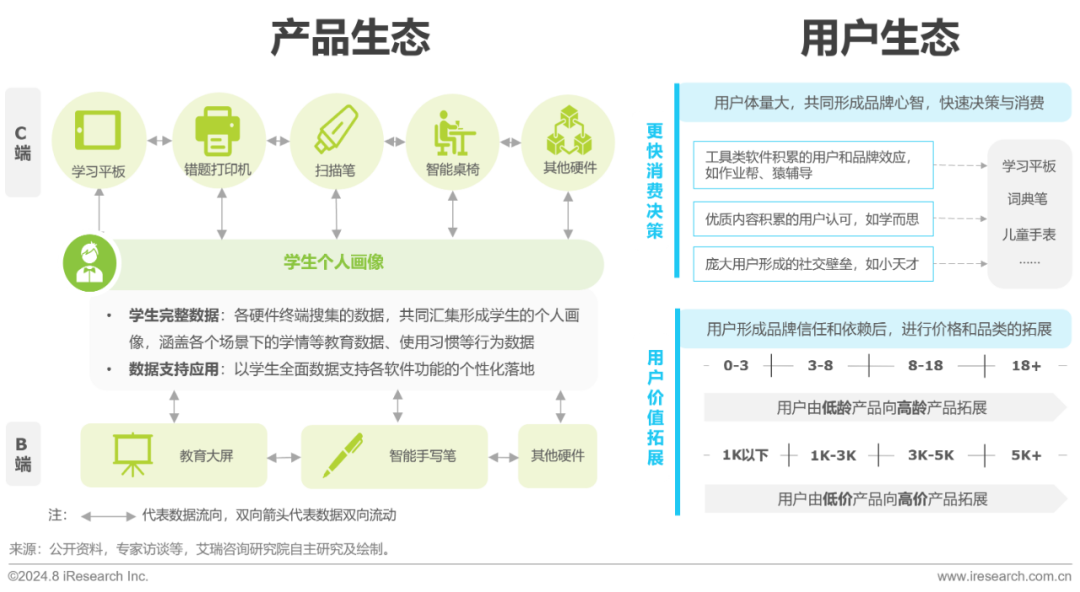 常态化、全场景的学情数据融通,是教育数字化转型的基础。用户生态指的是用户体量足够大之后形成的品牌心智和依赖,在同类产品中,可实现该品牌的更短决策与优先下单。进一步发展,可基于品牌实现低龄产品向高龄产品的拓展,覆盖用户更长的生命周期,以及可以实现由低价产品向高价产品的拓展,挖掘更多的高价值用户。