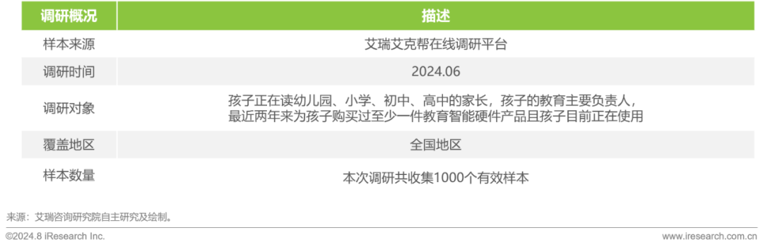 本次调研采用问卷调查方法,通过艾瑞艾克帮在线调研社区收集样本,针对近两年内为孩子购买过教育智能硬件产品的家长进行调查。调研旨在从孩子家庭教育决策者和教育用品采购者的角度出发,深入了解各类型教育智能硬件在孩子学习中的定位、具体应用场景、家长评价、购买驱动力以及当前存在的痛点。