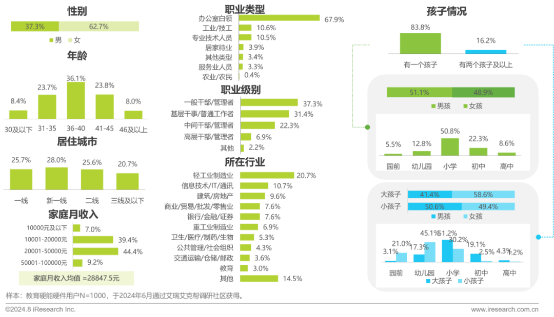 负责孩子教育且近两年来购买过教育智能硬件的家长用户以31-45岁的母亲居多,多数生活在经济较发达的一二线城市,家庭月收入多分布在1-5万元;职业集中在办公室白领,近七成任职管理类职务;孩子在各个学段均有覆盖,其中小学生家长比例更大。