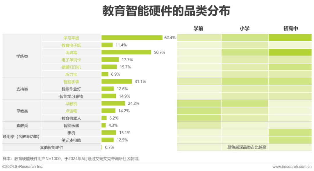 各学段孩子在教育智能硬件的应用上呈现明显差异:在学前阶段,多样的早教机和与绘本配套的点读笔是主流;在小学阶段,学习平板、词典笔和智能手表成为标配;初高中阶段,硬件品类进一步丰富,学习平板、词典笔和错题打印机成为更常见的组合。