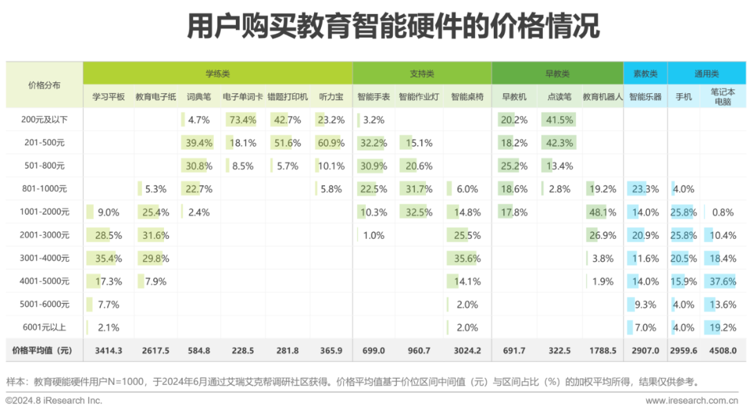 教育智能硬件各品类价格分布呈现明显差异。作为主流品类,学习平板因品牌和型号众多,呈现明显的产品价格层次,用户主要选择2000-4000元区间的产品,平均价格为3414.3元,基本上和通用消费电子类平板在一个价格层次。