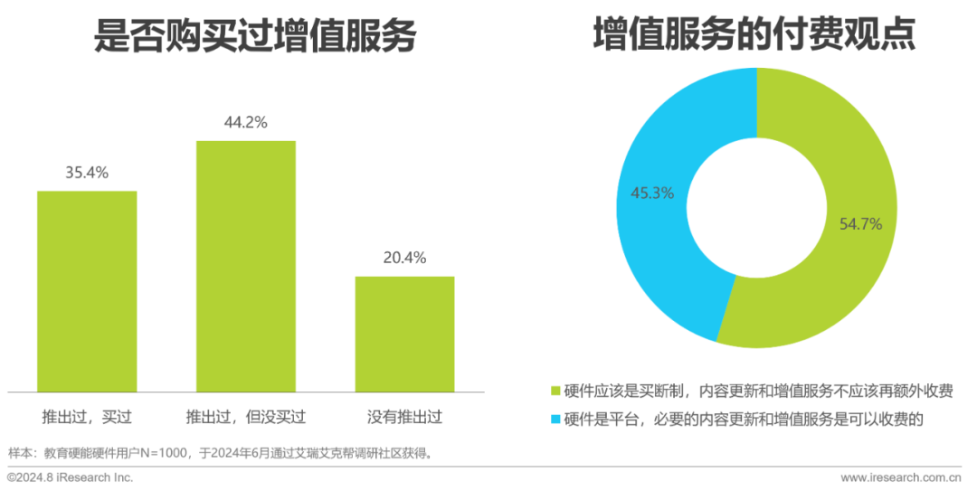 但随着产品渗透率的提高,因品牌信任或产品依赖而带来的增值服务多次收费或将成为未来可期的模式,如学习平板中独家优质教育资源的收费更新,或教育大屏中辅助教师教研的高级工具等。从用户调研来看,接受增值服务付费的用户已占据近一半的比例。
