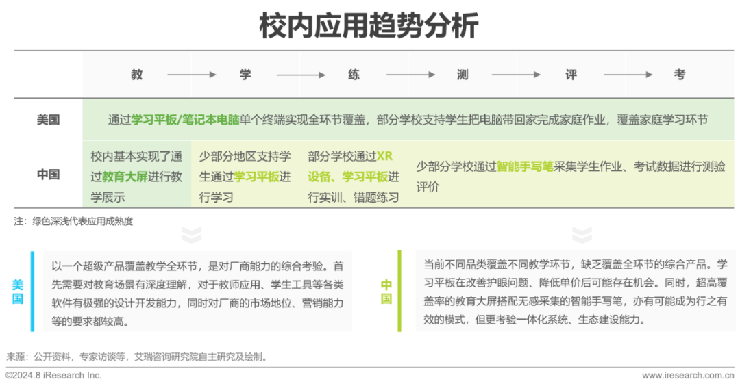 在我国的中小学互联网接入、多媒体教室、“三通两平台”等教学环境建设取得重要成效的新阶段,深入教学环节的数字化建设更加依赖各类教育智能硬件。从发达国家美国来看,通过学习平板/笔记本电脑覆盖教学全环节,可显著提高教育数字化水平,打通数据在各教学环节和场景的流转及高效利用。当前中国校内的教育智能硬件应用仍较为分散,各教学环节未实现硬件的统一,不同环节硬件应用的成熟度也存在较大差异。放眼未来,学习平板作为更加综合的品类,在改善护眼问题、降低单价后仍可能存在机会。同时,超高覆盖率的教育大屏搭配无感采集的智能手写笔,亦有可能成为行之有效的模式,但更考验一体化系统、生态建设及运营能力。