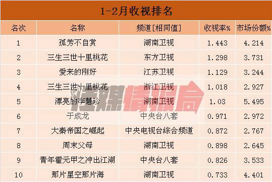 从1—2月的电视剧收视排名来看,《三生三世》的成绩也十分亮眼,双平台的收视率均跻身前五,并成为2017年首个双星破1的电视剧,给2017电视剧市场开了一个好兆头。