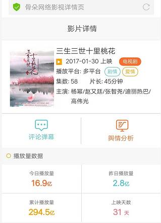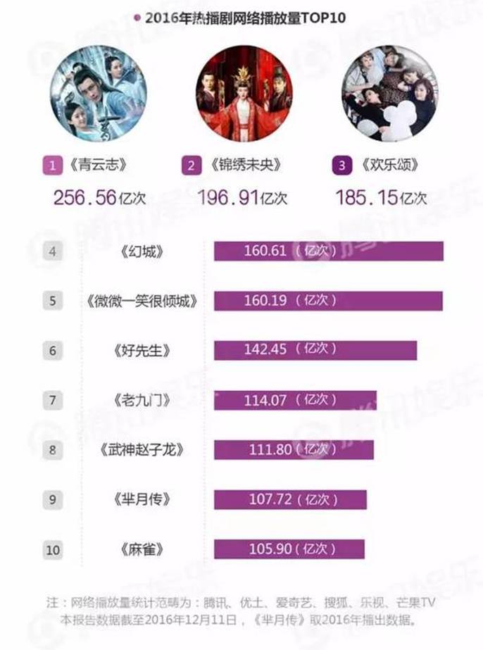 据《2016腾讯娱乐白皮书》,2016年热播剧网络播放量排行,仅有11部加入百亿俱乐部,《青云志》以256亿问鼎冠军,《锦绣未央》《欢乐颂》分别以196亿和185亿位居亚季军。全网播放量一举超过《青云志》,《三生三世》可谓是开年实力圈粉大剧。