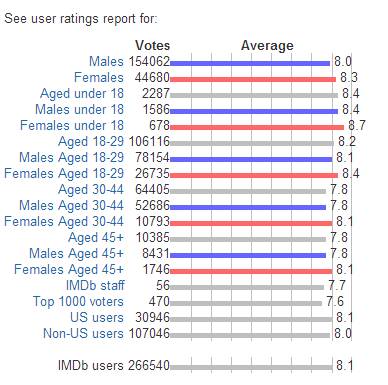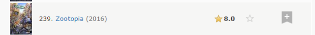 IMDb对电影的评价方式并不是根据电影的票房情况或所获奖项等客观效绩,而是采用普通大众打分的机制。凡是注册的IMDb用户都可以用 1-10 颗星的标准为一部电影打分,最后 IMDb会采用算术平均数 (Arithmetic mean) 的方法计算出一个加权平均星数作为最终得分。比如,去年火热的《疯狂动物城》综合266,540IMDb用户的评分情况所得到最终分数——8.1星