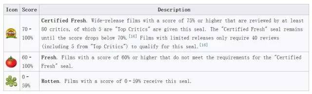 烂番茄的新鲜度是用百分比的,意思就是有多少比例的影评人推荐。此外,你还会经常在电影所获百分比旁边,看到三种评价标识