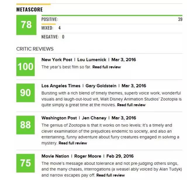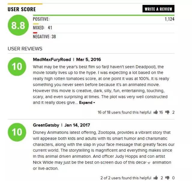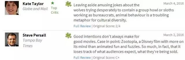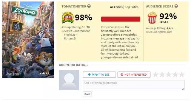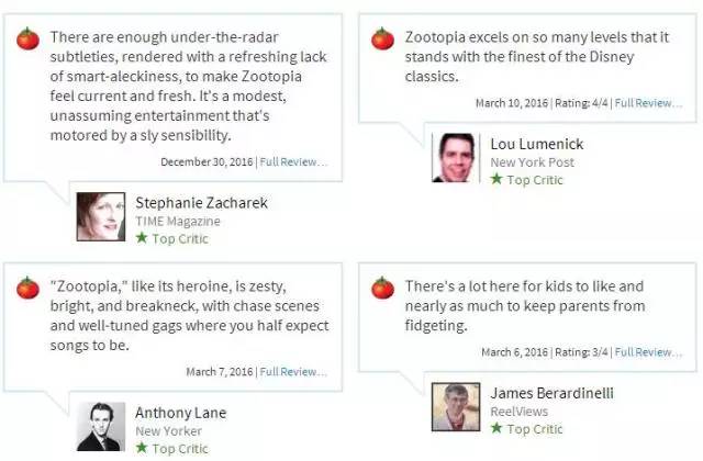 如果这部电影有超过60%的影评人推荐,烂番茄会用红色番茄来标识这部电影,即新鲜度为 Fresh,属于中等水平。如果电影有80位以上且超过75% 的影评人推荐,就像上面的《疯狂动物城》一样,就会得到一个类似金牌的标识,此时的新鲜度就上升为Certified Fresh等级。但如果推荐该电影的影评人低于60%,那么就只能得到那一坨绿色的烂番茄了,都是些口碑极差的作品。