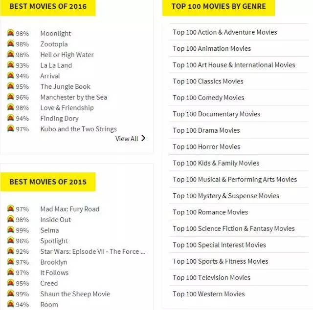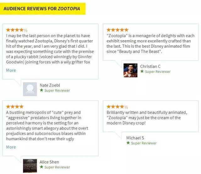 烂番茄也做了很多分门别类的排名,但其中最受欢迎的就是每年年初推出的“金番茄奖”。该奖的评选除了以日常评分为基础,还会兼顾了影评人数(影评数量)对评分的影响,再利用贝叶斯算法得出最终分数。就在前不久,第十八届“金番茄奖”刚刚火热出炉,其中《疯狂动物城》以重新打分后为106.749%的新鲜度夺得年度最佳公映影片。