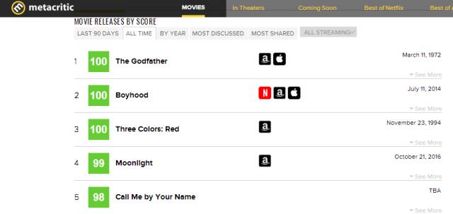 在Metacritic上也有一个实时更新的电影榜单,叫做 "Best Movies of All Time",不过和IMDb Top 250电影榜单那是天差地别。IMDb上稳居榜首的《肖申克的救赎》并未在Metacritic榜单拿到较高名次,这的千年第一是另一部大家耳熟能详的大片《教父》。这大概就是普通观众和专业人士眼光的差别吧。