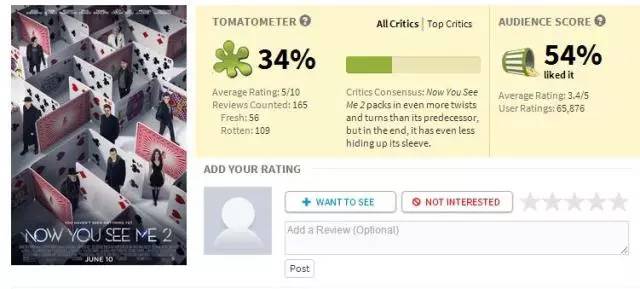 同时,烂番茄为了确保用户的意见也能够得到在这里体现,专门开设了一个Audience Score观众分数,用爆米花的标识来表示。凡是注册的用户都可以评星和评论,不过最后在电影的介绍页面上体现出来的,是所有打出 3.5星(满分5星)以上的用户比例。