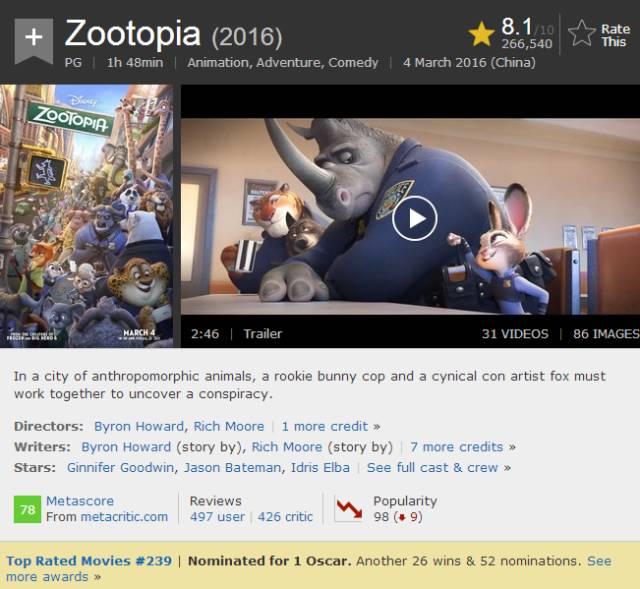 《疯狂动物城》的推荐票