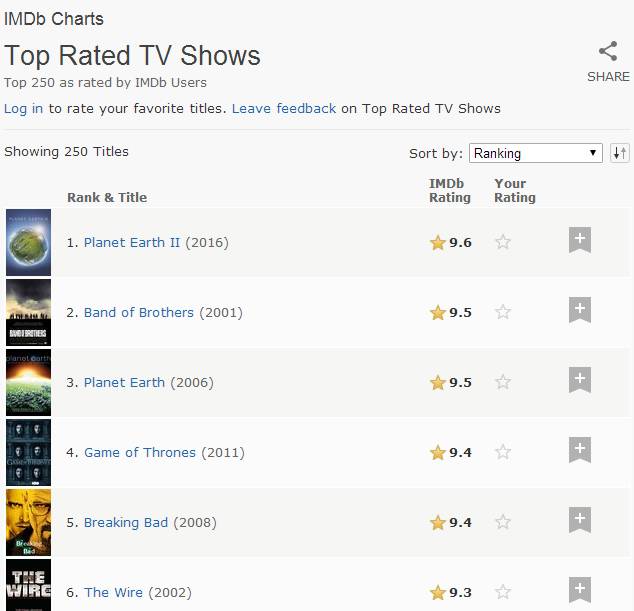 乘胜追击,从2015年起,IMDb开始推出了Top 250电视剧榜单,和电影榜单不同的是,入围该榜的近年新作比较多。其中位居榜首的是去年BBC推出的一部大型纪录片《行星地球2》。