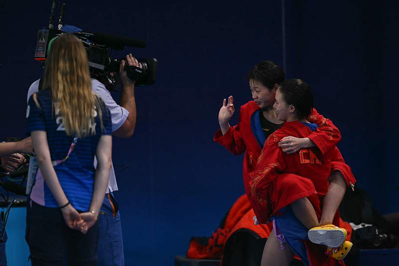 离开水面后,全红婵和陈芋汐拥抱在一起,庆祝两人为中国跳水队包揽这一项目的金银牌。六天前,在同一片比赛场地,两人携手拿下女子双人十米台项目的金牌。陈芋汐抱着全红婵退场,全红婵则俏皮地对着镜头比出“拿捏”的手势。