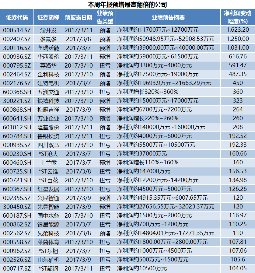 本周业绩预增并最高增幅翻倍的公司还有华西股份(000936.SZ)、金利科技(002464.SZ)、江特电机、银禧科技(300221.SZ)、梅雁吉祥(600868.SH)、万业企业(600641.SH)、隆基股份(601012.SH)、士兰微(600460.SH)、兴民智通(002355.SZ)、先导智能和兄弟科技(002562.SZ)。